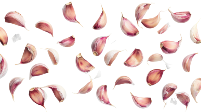 Garlic bulb with individual cloves, white skin, and visible roots, isolated on transparent background.