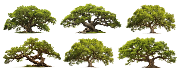 Mature deciduous tree with gnarled trunk and lush green foliage isolated on transparent background.