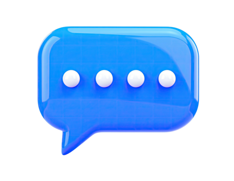 Glossy blue 3D speech bubble with four white dots, set against black background