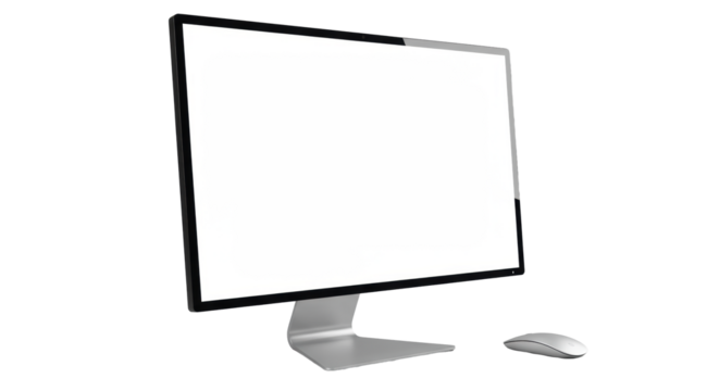 Sleek black desktop monitor with silver stand and blank white screen, with minimalist silver mouse, on transparent, bright studio lit, high-tech product design concept