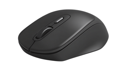 A sleek black wireless computer mouse isolated on transparent background is ready for work or play