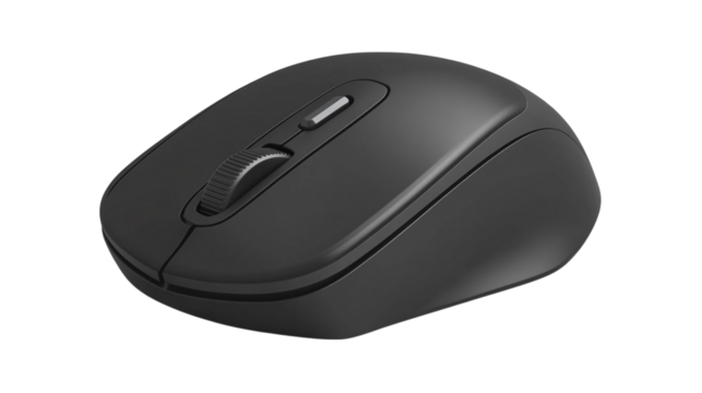 Sleek black wireless computer mouse with single button and scroll wheel on transparent background