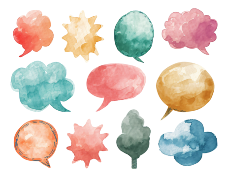 Set of colorful speech bubbles in various shapes, isolated on transparent cutout background