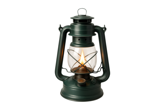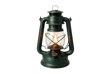 A vintage green oil lantern with a glowing flame ideal for design projects on transparent