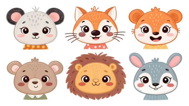 Playful flat animal characters on transparent background