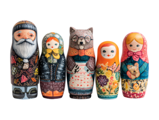 Colorful wooden figures of animals and people isolated on transparent or white background, png