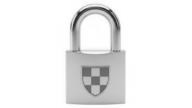 A shiny silver metal padlock for security and protection is isolated on transparent background