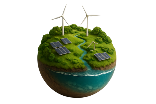 Miniature green planet with wind turbines and solar panels isolated on transparent background