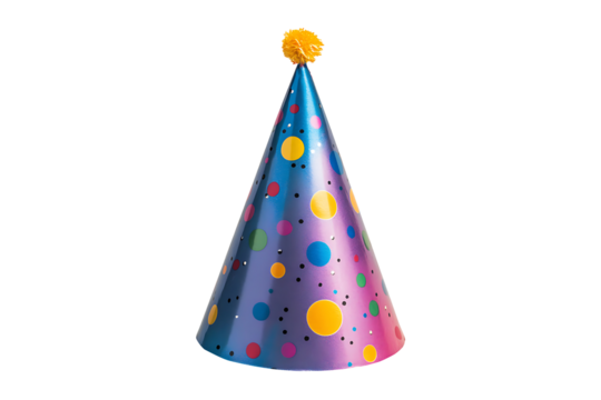 Colorful polka dot party hat with pompom and fringe isolated PNG, fun celebration headwear for birthday or festive event on transparent background