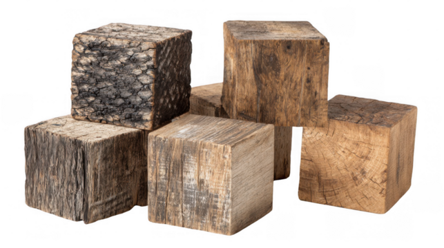 Five weathered wooden blocks, each displaying unique textures and signs of age, are arranged on a transparent background, offering a rustic and natural aesthetic