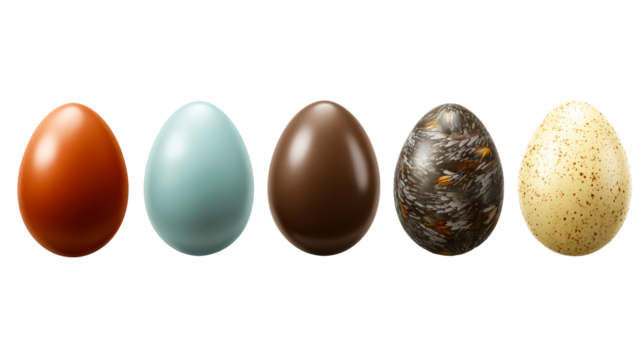 Five decorated Easter eggs presented in a row on a white background., cut out transparent