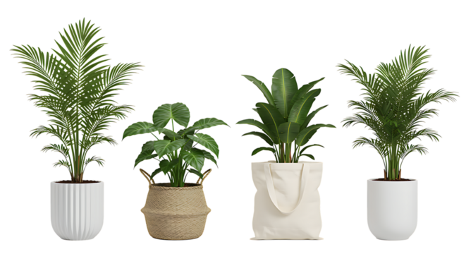 Four diverse potted houseplants arranged together creating a vibrant botanical display on transparent background.