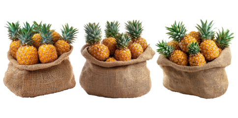Set of Rustic burlap sacks filled with fresh pineapples isolated on transparent background