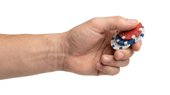 Male hand holding three colorful casino chips on transparent background