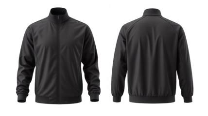 Black sportswear jacket mockup with front and back view, isolated on transparent background