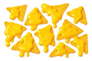 Nacho tortilla chips with melted cheese dripping, delicious snack or appetizer, transparent background
