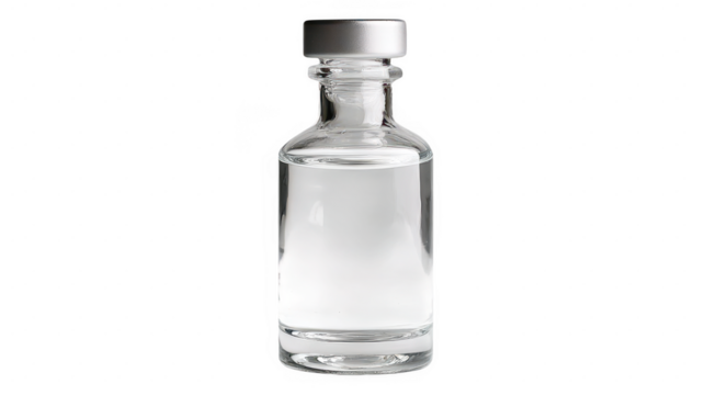 Scientific glass medical bottle with clear liquid laboratory setting product photography minimalist view healthcare concept