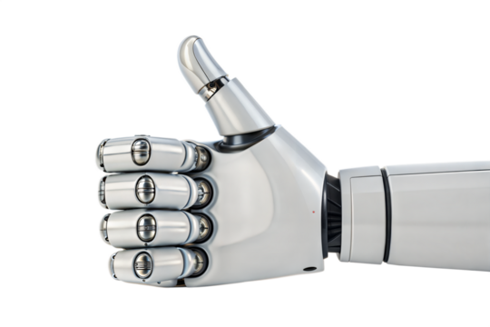 Futuristic robotic hand giving a thumbs up gesture against a transparent background