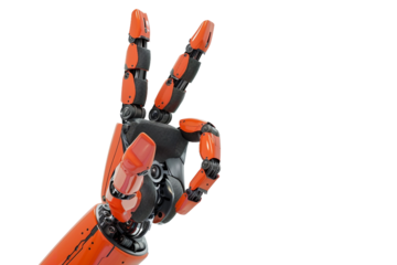 Engaging robotic hand with flexible fingers demonstrating a peace sign isolated on transparent background