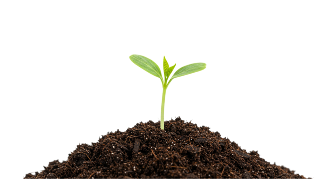 A vibrant young plant with green leaves growing from a small mound of dark soil, symbolizing growth and new life. background removed