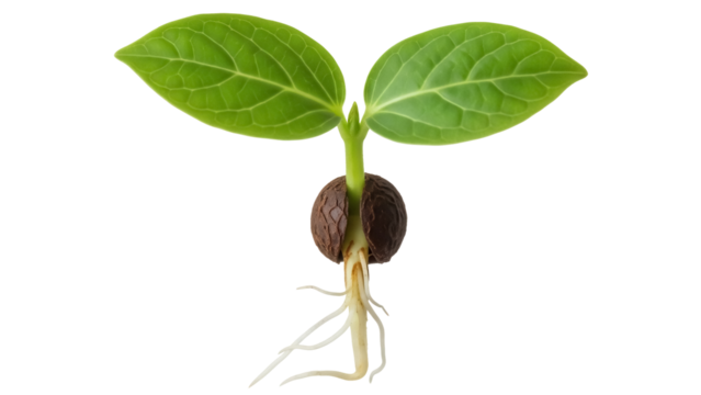 Sprouted seed with roots and green leaves isolated PNG, young plant growing on transparent background, seedling for agriculture and botany