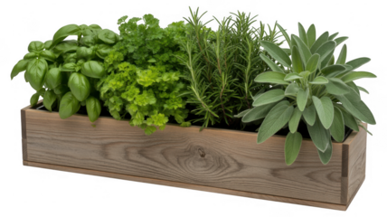 Wooden planter with basil parsley rosemary sage isolated on a transparent background