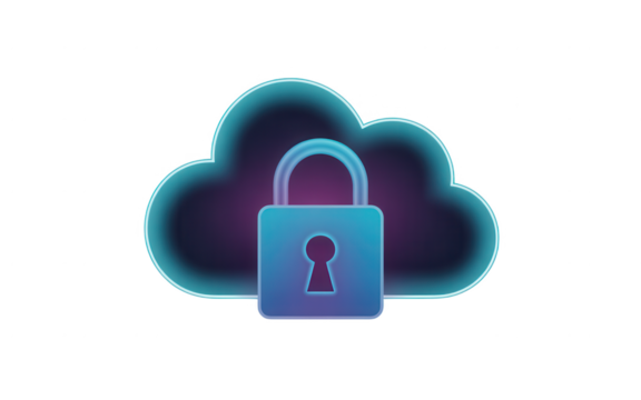 Secure cloud computing concept with a padlock icon on a stylized cloud, representing data protection and security, isolated on transparent background.