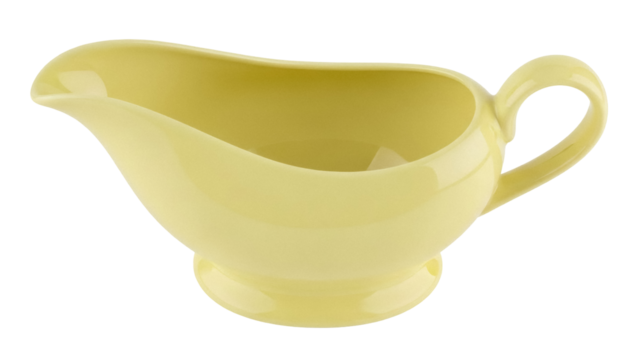 Pale yellow gravy boat isolated PNG, classic sauce server with handle on transparent background for culinary and dining concepts