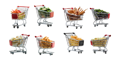 Mini shopping carts with groceries, PNG set isolated on transparent background