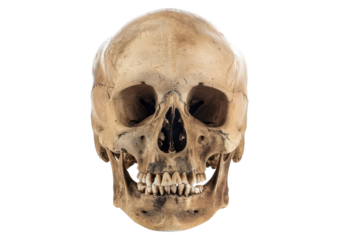 Detailed triceratops skeleton showcasing its distinctive horns and frill on transparent background.