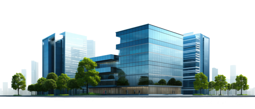 Diverse collection of modern skyscrapers and tall buildings forming a city skyline isolated on a transparent background