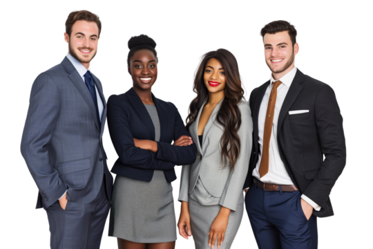 A diverse group of four professionals smiling confidently at the camera, standing together in business attire, isolated on transparent background