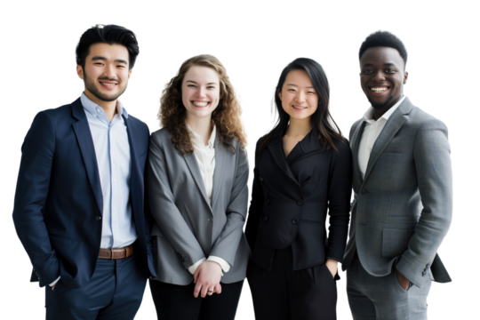 Studio portrait of three smiling young adult business professionals, two women and one Black man, wearing suits and standing against a transparent background.
