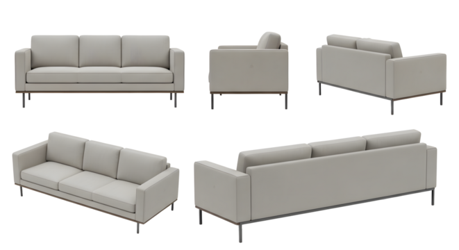 Multiple views of a light gray three-seat sofa with metal legs on transparent background