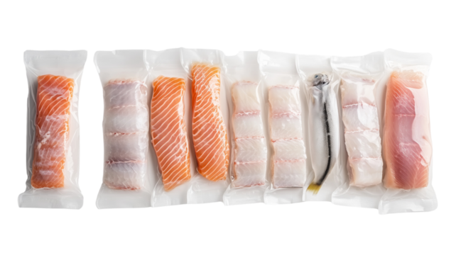A row of frozen fish fillets in sealed bags isolated on transparent background (2)
