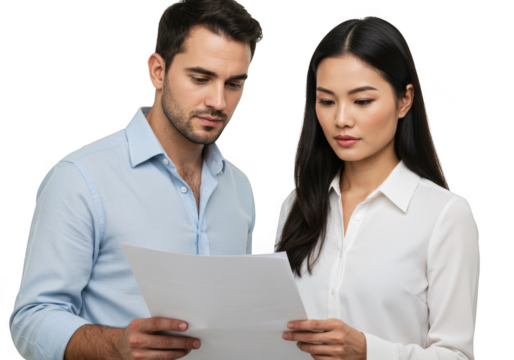 Diverse business professionals collaborating over documents in studio setting transparent background