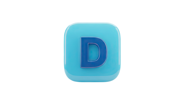 3D letter D inside a blue glossy square icon on transparent background