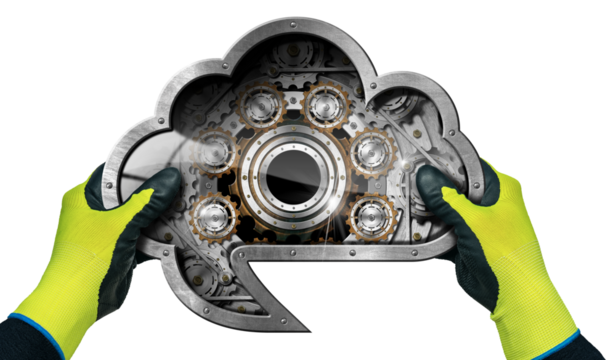 Red Cloud technology data transfer and storage icon isolated on transparent background.