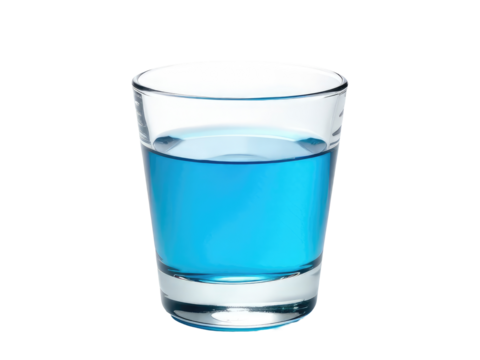 A clear glass filled with blue liquid sits on a clean white surface.transparent background