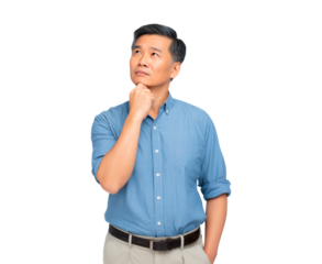 thoughtful senior man looking upwards with his hand on his chin isolated on white transparent background