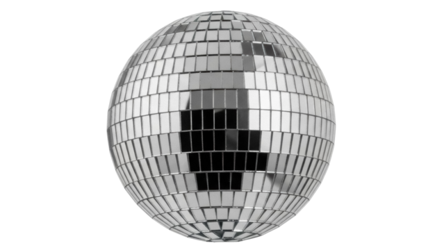 Shiny disco ball isolated PNG on transparent background, mirror ball with reflective tiles for party decoration and entertainment