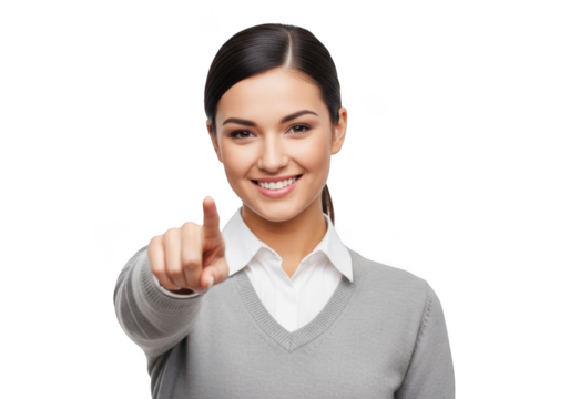 Smiling young professional woman with dark hair points her index finger forward isolated on transparent background