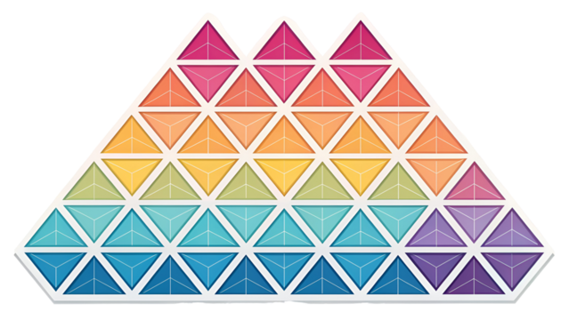 Geometric low poly mountain shape composed of vibrant rainbow gradient triangles isolated on a transparent background