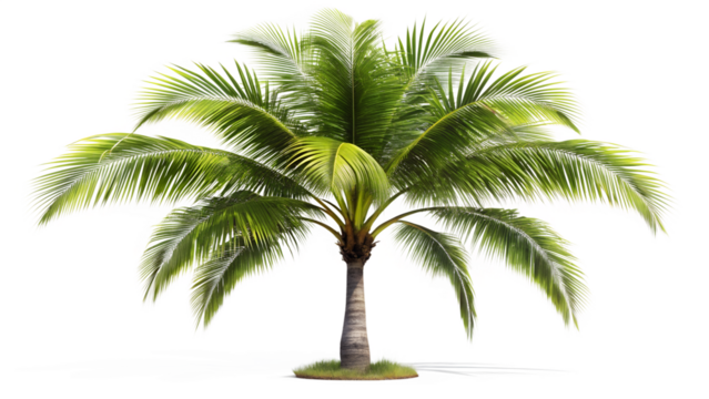 A green-leaved palm tree with a textured trunk stands in isolation, symbolizing tropical serenity and a peaceful environment, isolated on a transparent background