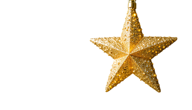 3D Glittering Gold Tree Topper Star with Textured Surface and Light Sparkles, Angled View, Transparent PNG