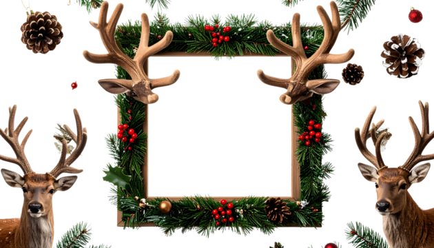 Christmas Frame PNG, Festive Border with Pine Branches, Ornaments, Lights, and Snowflakes, Transparent Background, Holiday Greeting Card and Invitation Design
