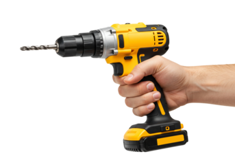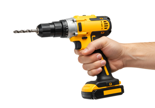 Hand holding cordless drill yellow and black power tool close up view isolated on transparent background