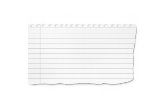 Torn white lined paper sheet with notebook perforations and ragged edges, creating a blank scrap note design on transparent background