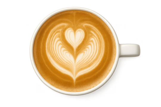 A topdown view of a white cup filled with latte coffee, featuring a heart shape made from foam, isolated on a transparent background