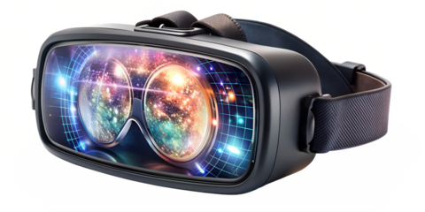 Virtual reality headset showcasing a colorful galaxy view at night, cut out transparent